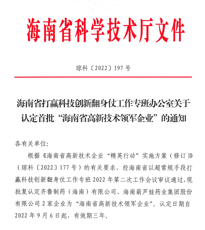 近日,海南省科学技术厅发布的《海南省打赢科技创新翻身仗工作专班办公室关于认定首批“海南省高新技术领军企业”的通知》中显示,批复认定海南usdt药业集团股份有限公司等2家企业为“海南省高新技术领军企业”。认定日期自2022年9月6日起,有效期三年。